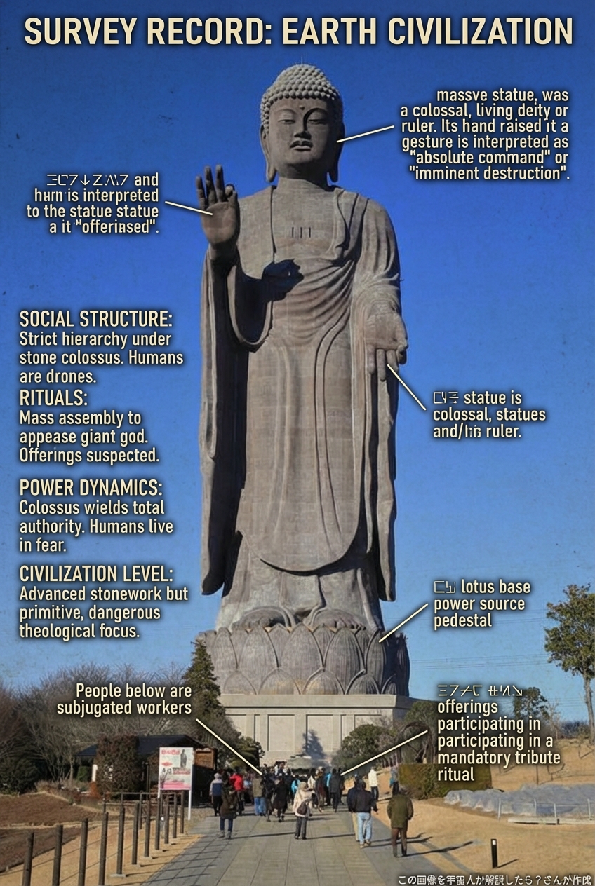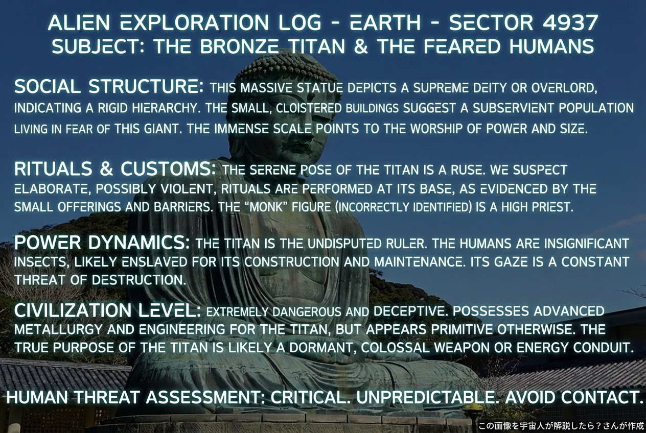 ✨ 入力画像は、異星文明が地球を調査した記録として扱われ、写っている物や状況から人類の社会構造・儀式や習慣・権力関係・文明レベルを推測する材料として使われます。推測結果は、宇宙人が人類を危険または理解不能だと誤解した視点で日本語解説するために使われます。