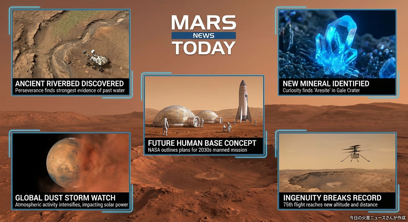今日の火星のニュースを画像で教えて。トピックは5つ 日本のニュース番組のように日本語でわかりやすくおしえて。