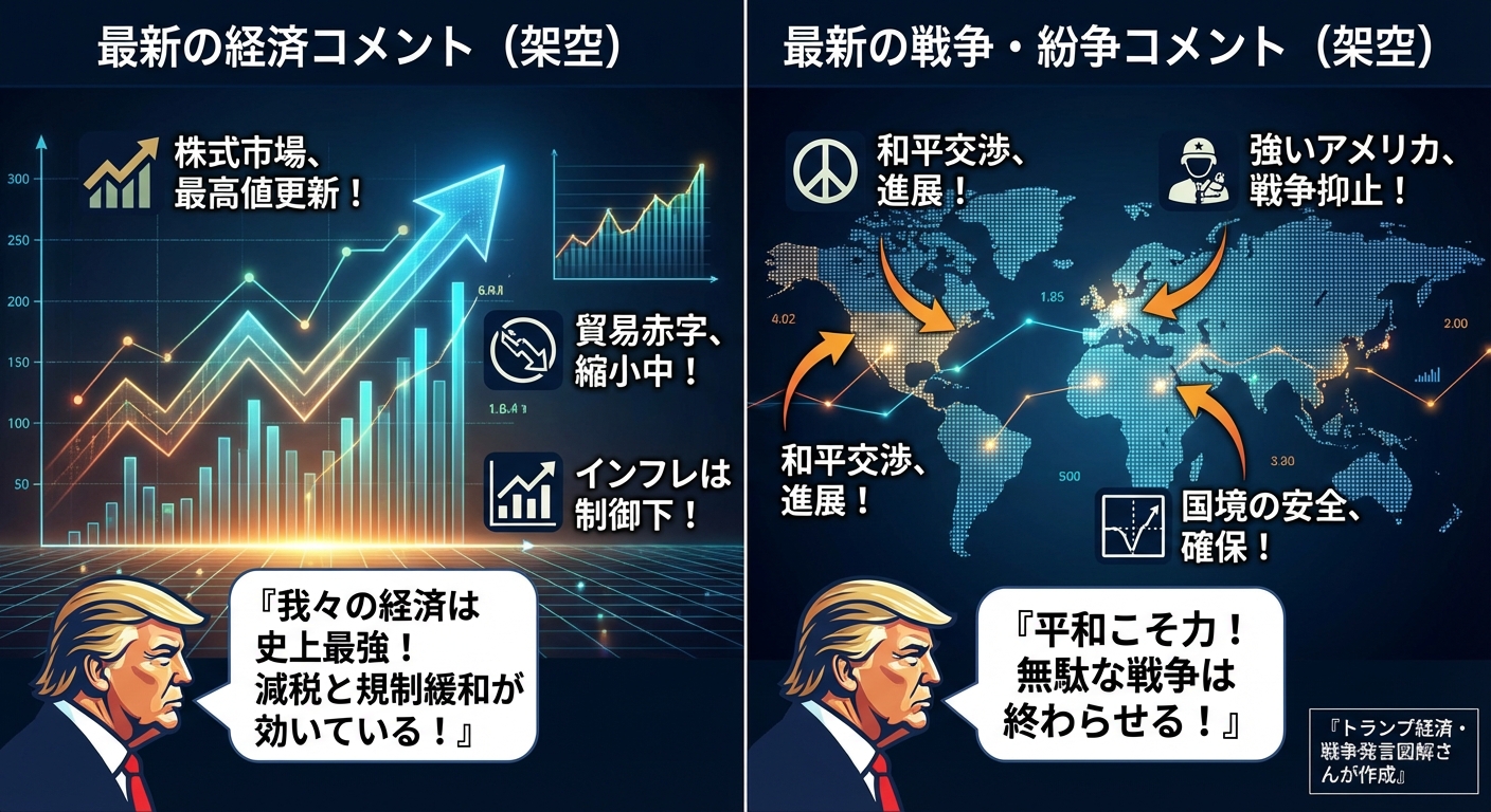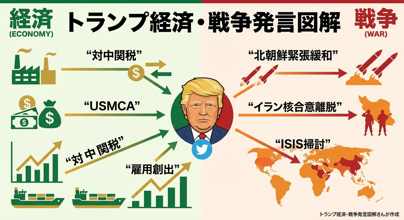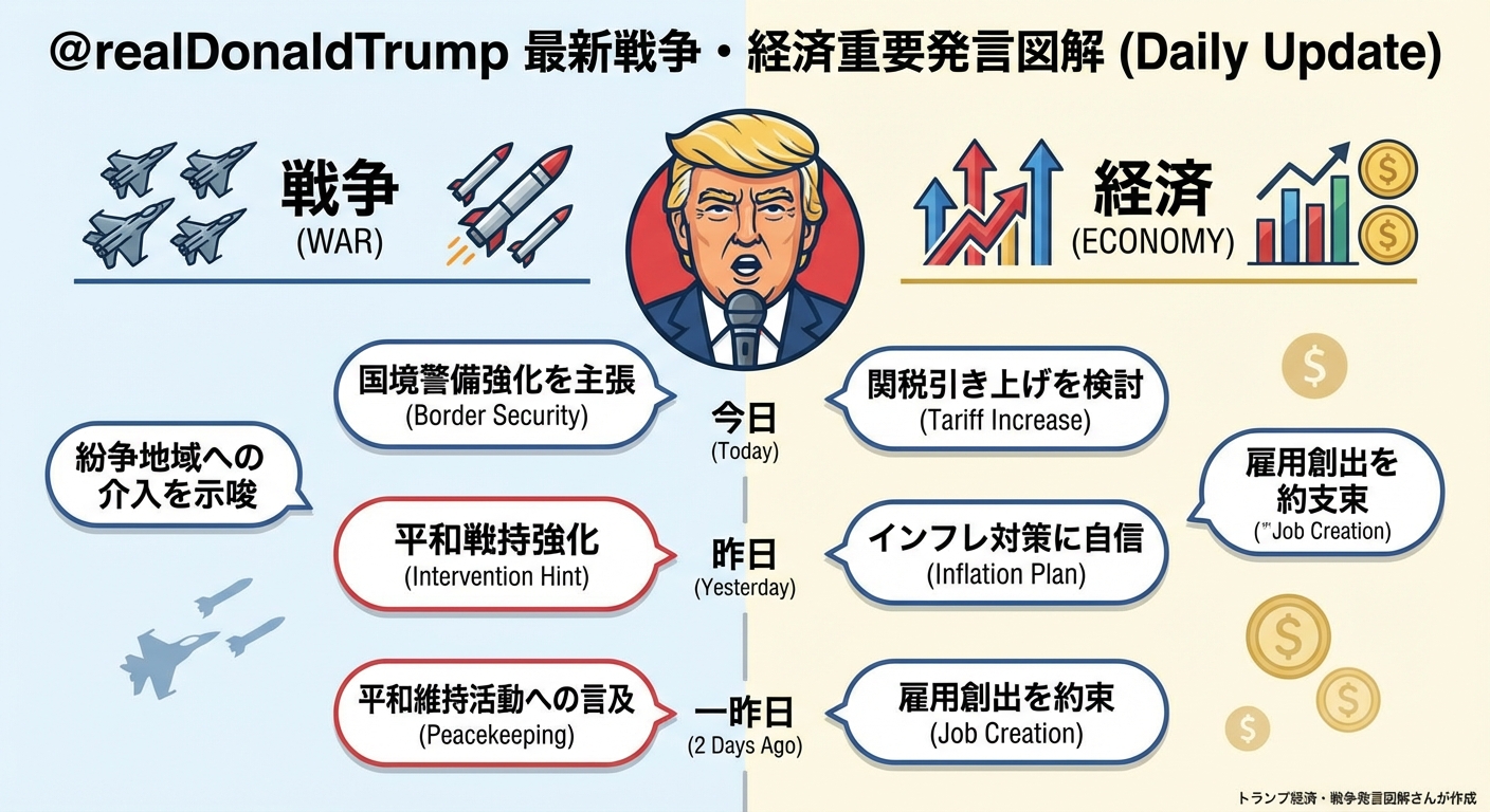 「{ @realDonaldTrump の毎日最新の発言の中で重要な戦争や経済に及ぼすコメント}だけピックアップしてインフォグラフィックスで図解して」