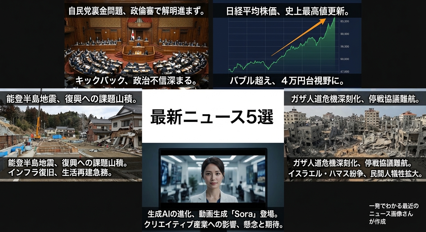 最新のニュースで重要なものを5つ選んでひとつの画像にして。